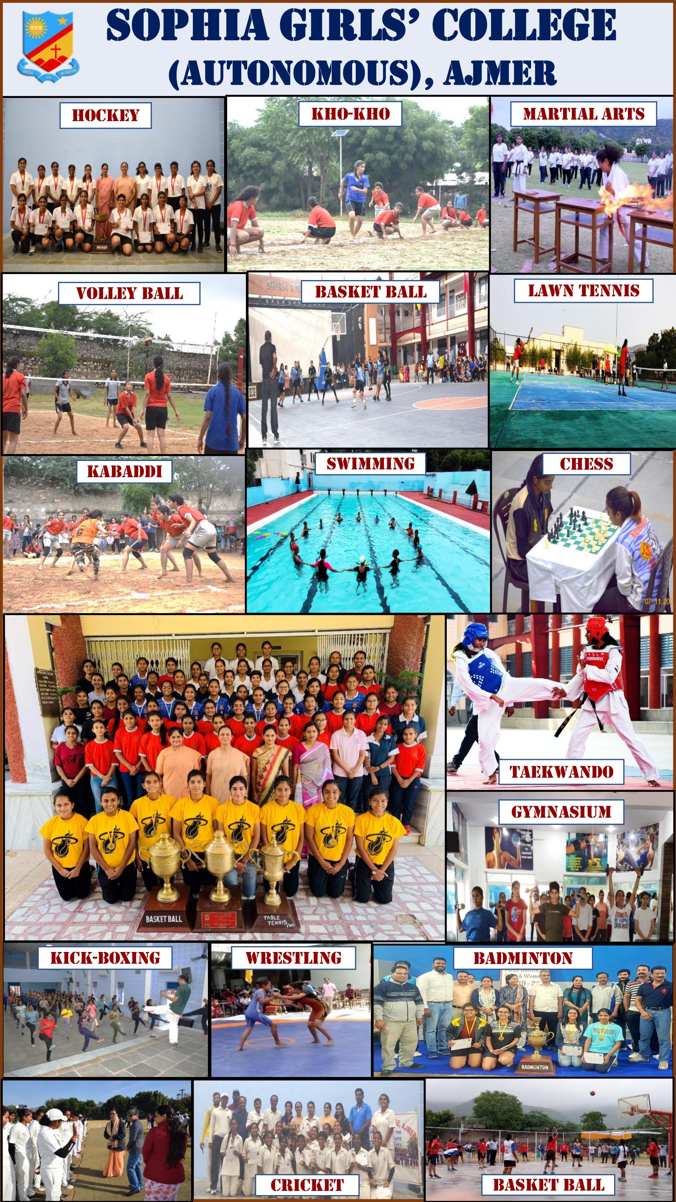 Sophia College (Autonomous), Ajmer provides facilities for Indoor and Outdoor sports and games for students such as- Volleyball, Shooting, Basketball, Badminton, Wrestling, Cricket, Taekwondo, Table Tennis, Athletics, Chess, Lawn Tennis, Swimming, Hockey, Softball, Martial Arts, Kho-Kho, Kabaddi, Handball etc., to help them develop interpersonal skills such as team work, cooperation, accountability, punctuality, trust and leadership.